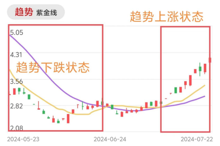 趋势紫金线,通过简单的金线和紫线就能判断该股是否还处在向上/向下的趋势中。